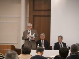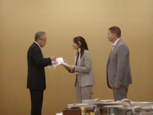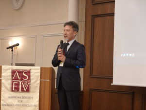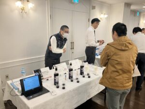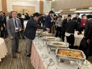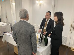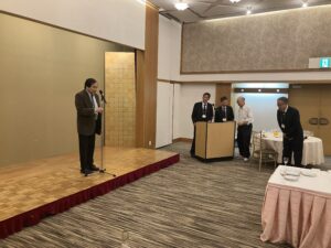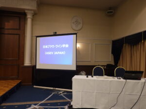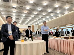 情報交換会では、日本ブドウ・ワイン学会会長 大滝敦史氏(メルシャン)と、アメリカブドウ・ワイン学会会長 Michelle M. Moyer氏、Josh氏による挨拶がありました。名誉会員である米虫節夫氏による乾杯の挨拶で、情報交換会が始まりました。